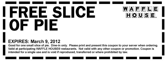 Waffle House has a printable coupon out for a FREE slice of pie! Coupon is good though 3/9/12. Dine-in ONLY.
